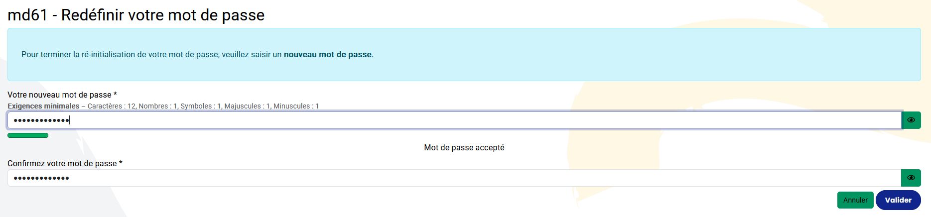 Choisir un mot de passe qui répond aux exigences de sécurité indiquées (12 caractères....), puis cliquer sur Valider.